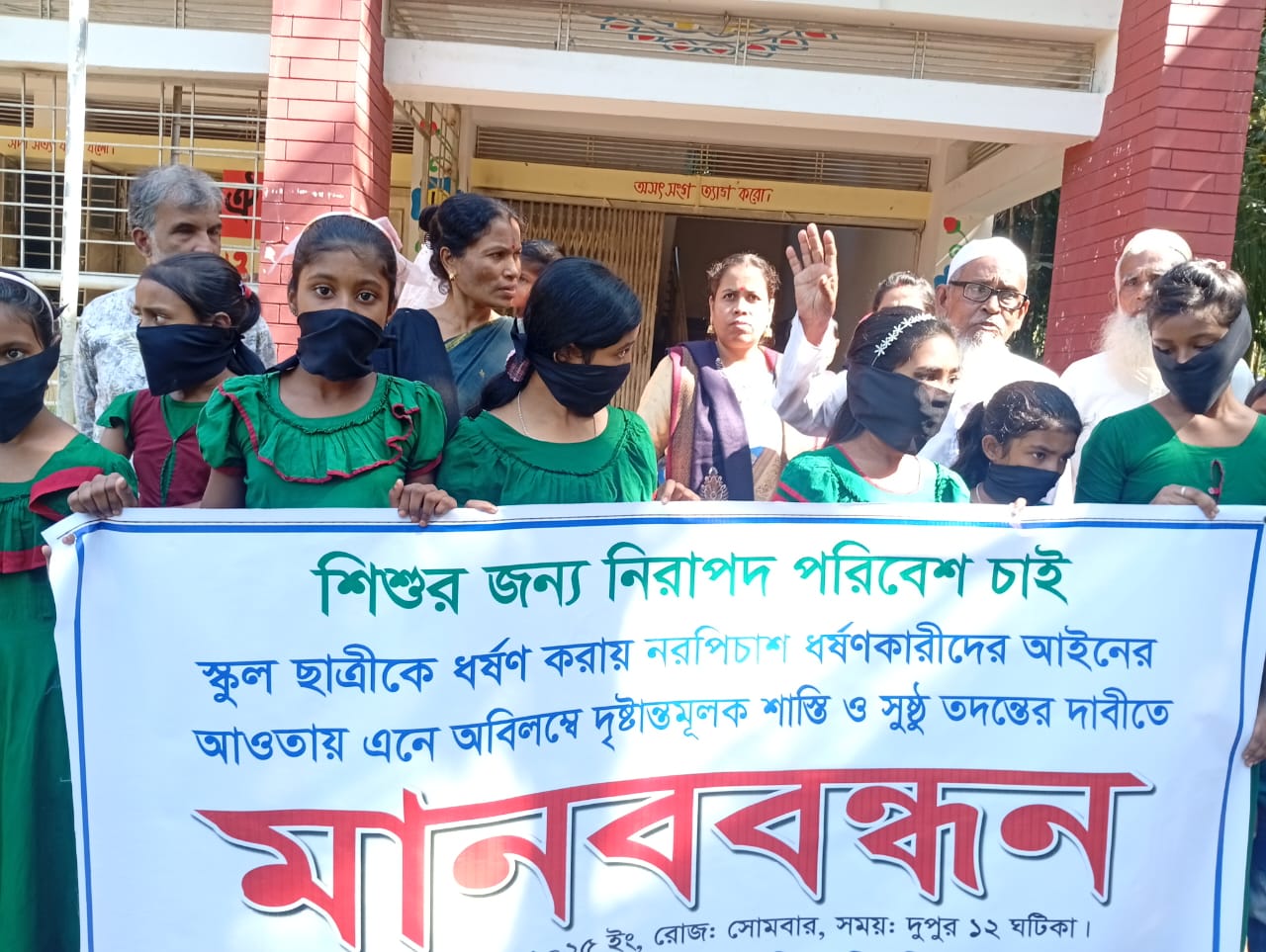 নেছারাবাদে ৪র্থ শ্রেণির শিক্ষার্থী ধর্ষনের বিচারের দাবিতে মানববন্ধন